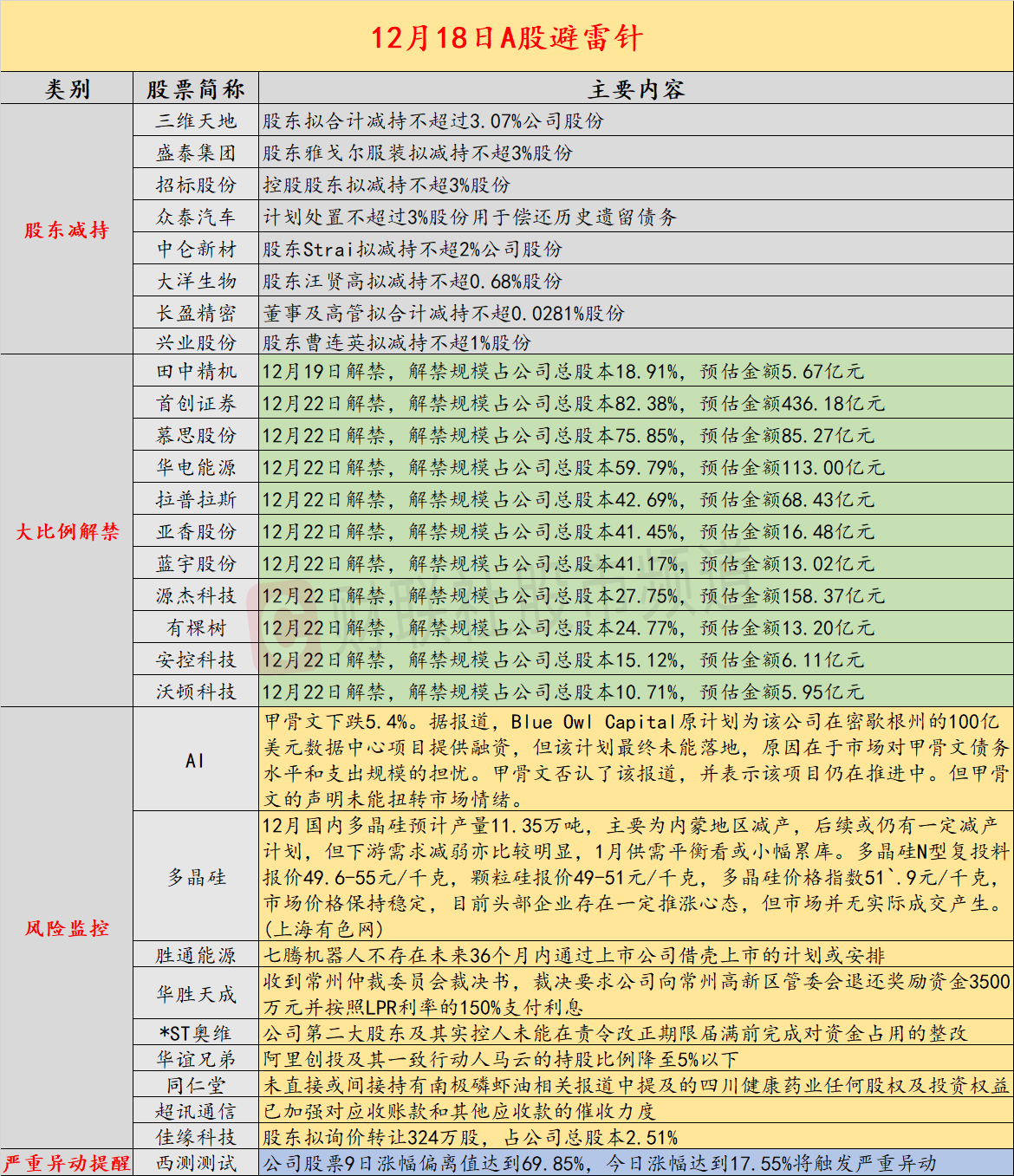 导读:财联社12月18日投资避雷针,近日,A股及海外市场潜在风险事件如下。国内经济信息方面包括:1)多只“宝宝类”货币基金收益率跌破1%;2)多晶硅后续或仍有一定减产计划,但下游需求减弱亦比较明显;公司方面重点关注包括:1)4连板胜通能源公告,七腾机器人不存在未来36个月内通过上市公司借壳上市的计划或安排;2)华胜天成收到常州仲裁委员会裁决书,裁决要求公司向常州高新区管委会退还奖励资金3500万元并按照LPR利率的150%支付利息;海外市场重点关注包括:1)美股三大指数集体收跌,大型科技股普跌;2)谷歌DeepMind CEO表示,AI泡沫大量存在于初创企业中。