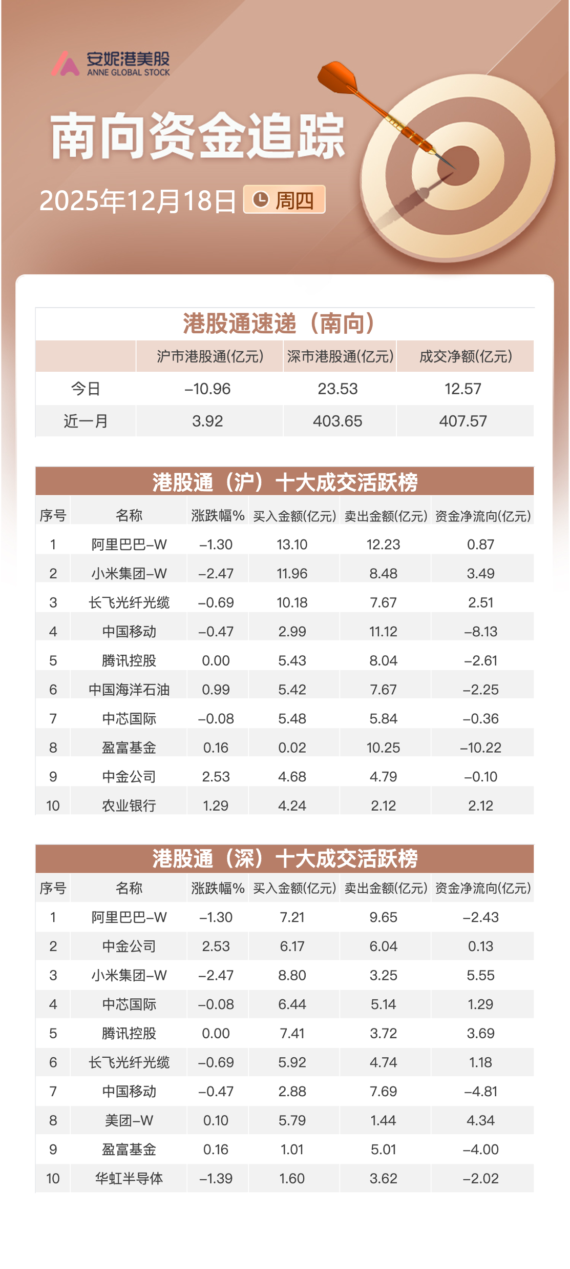 大幅净流出:中国移动(00941.HK)12.94亿港元;华虹半导体(01347.HK)2.02亿港元。