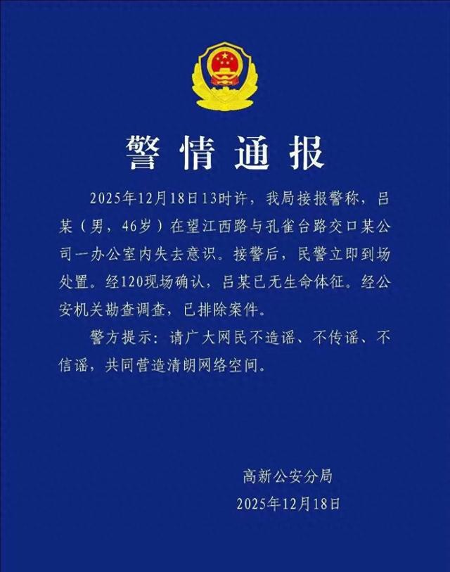 12月18日晚间,合肥高新公安分局发布警情通报。通报称:2025年12月18日13时许,我局接报警称,吕某(男,46岁)在望江西路与孔雀台路交口某公司一办公室内失去意识。接警后,民警立即到场处置。经120现场确认,吕某已无生命体征。经公安机关勘查调查,已排除案件。