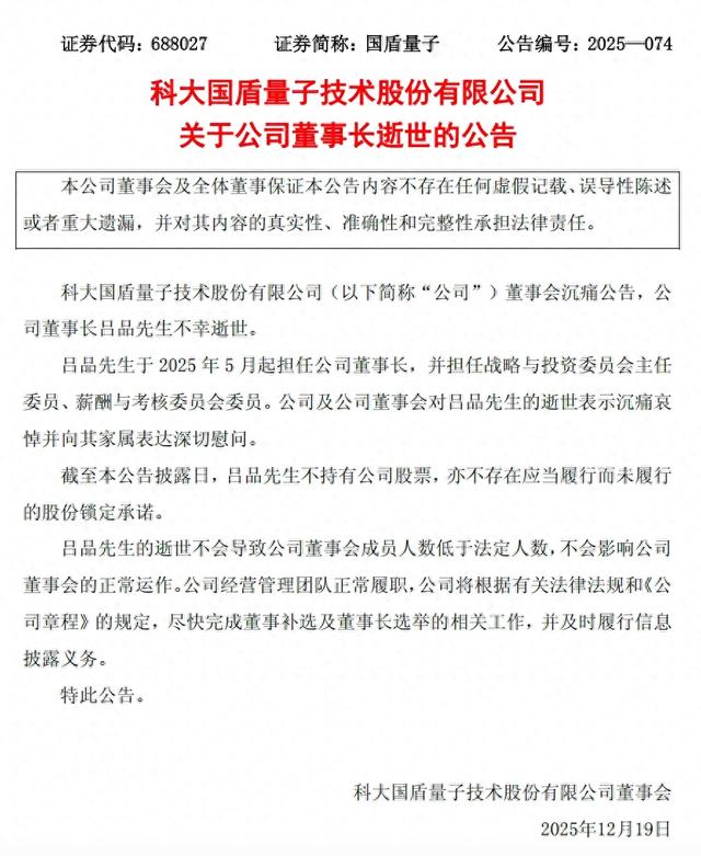 12月18日晚间,科大国盾量子技术股份有限公司(688027)公告,公司董事长吕品不幸逝世,具体内容如下: