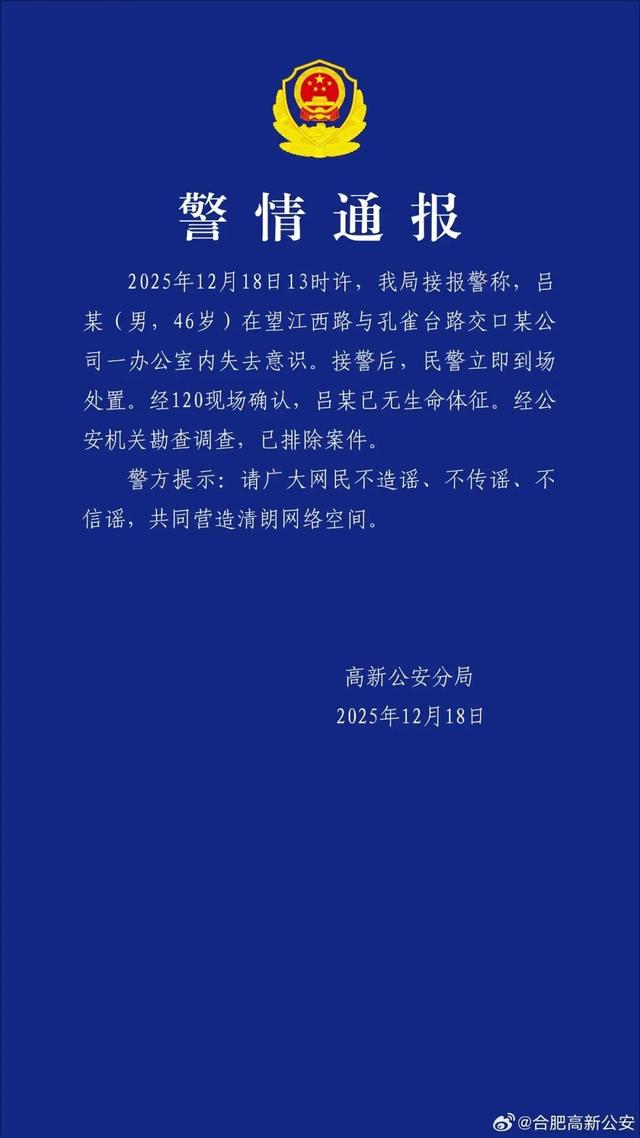12月18日晚,合肥市公安局高新技术开发区分局发布警情通报:18日13时许,我局接报警称,吕某(男,46岁)在望江西路与孔雀台路交口某公司一办公室内失去意识。接警后,民警立即到场处置。经120现场确认,吕某已无生命体征。经公安机关勘查调查,已排除案件。