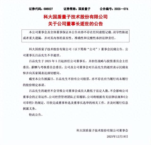 12月18日晚,科大国盾量子技术股份有限公司(以下简称“国盾量子”)发布公告披露,公司董事长吕品先生不幸逝世。