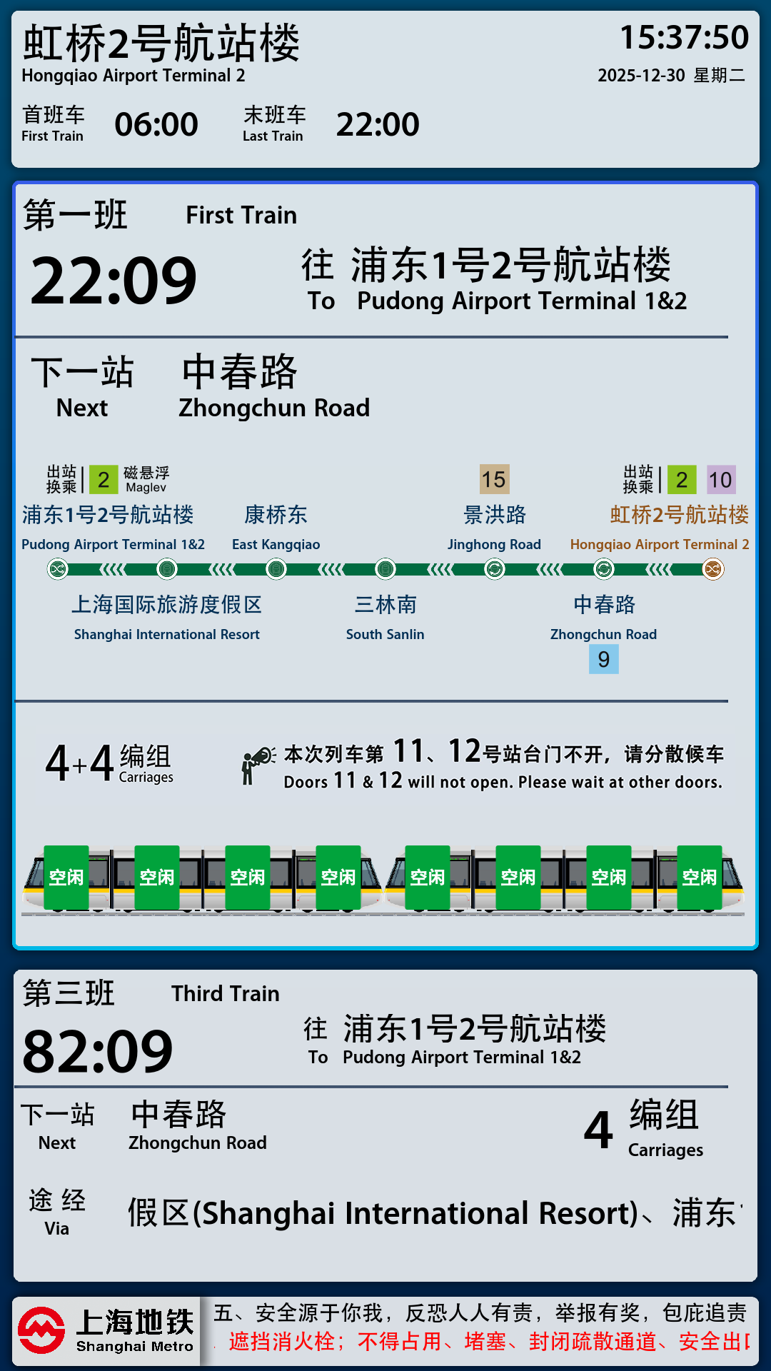 申通地铁集团介绍,2025年12月31日首班车起,上海轨道交通市域线机场联络线将正式上线国内首列市域C型“4+4”重联编组列车。自此,线路将进入 4编组、8编组、“4+4”重联编组三种模式协同运营的新阶段。为此,乘客等候“4+4”重联编组列车时,请务必注意:列车中部重联处的第11号、12号站台门将保持关闭。 为保障乘降安全与效率,车站已通过新增站台门提示标识、更新广播引导、强化现场服务等方式,协助乘客快速识别。“4+4”编组列车也将按照客流强度灵活调整,请乘客留意引导,避免在第11号、12号站台门处停留等候“4+4”重联编组列车,请前往相邻站台门有序排队上下车。