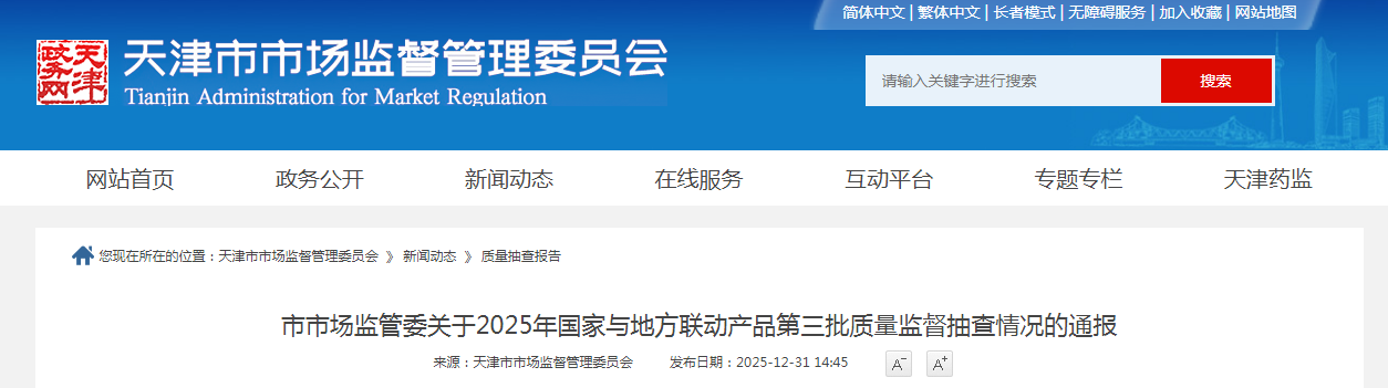 中国质量新闻网讯 据天津市市场监督管理委员会网站消息,按照《市场监管总局关于印发2025年产品质量国家监督抽查计划的通知》(国市监质监发[2025]24号)要求,各地市场监管部门要按照《2025 年产品质量国家与地方联动抽查计划表》中的产品、区域,组织开展国家和地方联动抽查。天津市市场监督管理委员会对天津市电动自行车、儿童及婴幼儿服装、家用燃气灶、燃气用具连接用软管、瓶装液化石油气调压器、家用可燃气体探测器、安全帽、建筑保温材料产品开展了质量监督抽查工作,现将抽查情况通报如下。