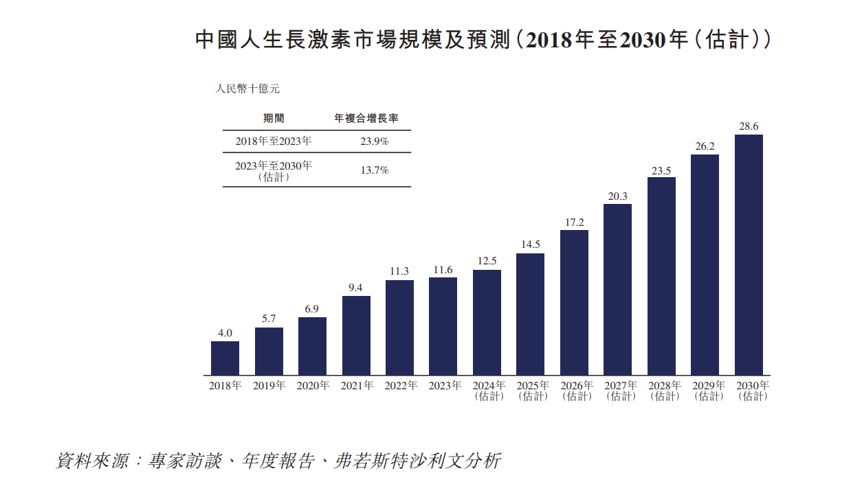 近年来,治疗需求的增加推动了国内生长激素市场的持续扩容,据弗若斯特沙利文数据显示,国内生长激素市场规模由2018年的40亿元人民币增长至2023年的116亿元人民币,期间年复合增长率达23.9%,预计到2030年,这一规模有望进一步攀升至286亿元人民币。
