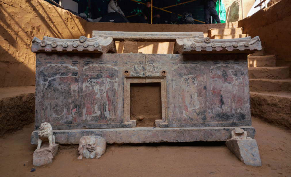 墓室置一座房型石椁,造型精美,装饰图像丰富,以减地平钑为主,局部施彩绘、贴金,将雕刻、彩绘、贴金工艺融为一体,展现了北周时期石雕技术的高超水准与装饰艺术的审美取向,是研究北朝晚期手工业技术与艺术风格的重要实物资料。图像内容以牛车鞍马图为主要表现题材,左右配以飞天乘龙、仙人御虎等升仙主题,与同时期粟特人墓葬石葬具有着较大差。