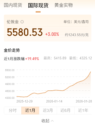 1月29日早盘,国际黄金市场再现历史性行情。现货黄金继续拉升冲破5500美元大关,最高触及5595.41美元/盎司,续创历史新高。截至金融投资网记者发稿,报5580.53美元/盎司,涨幅为3%。