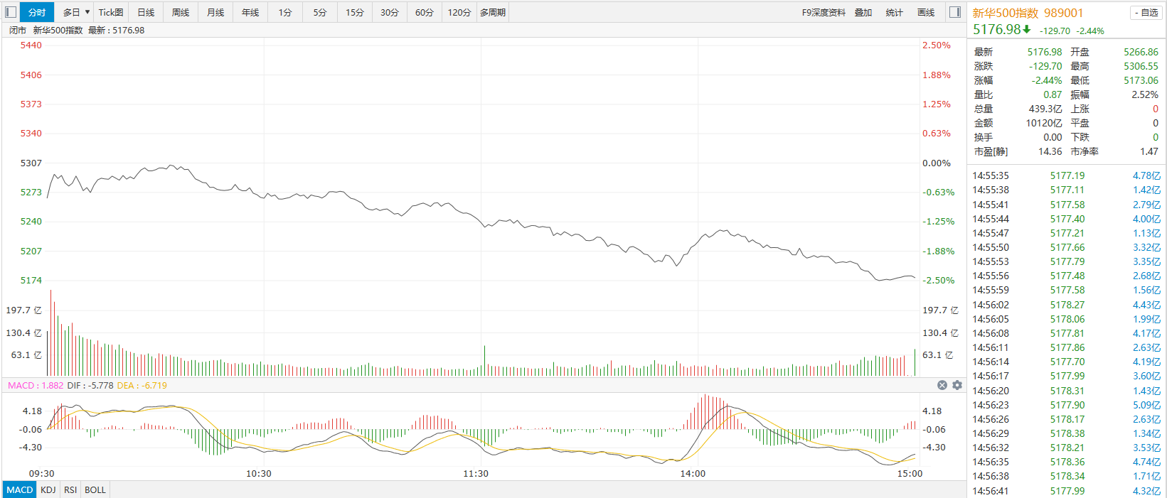 走势上看,新华500指数(989001)2日震荡走弱,最终跌逾2%。指数盘中最高触及5306.55点,最低触及5173.06点,成分股全天总成交额报10120亿元。