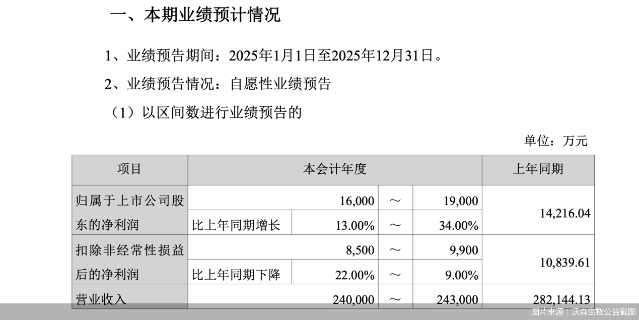 业绩预告显示,在出口疫苗产品收入同比增长叠加降本增效等管控措施下,沃森生物预计2025年归属于上市公司股东的净利润为1.6亿—1.9亿元,实现了同比13%—34%的增长;而扣除非经常性损益后,净利润为8500万—9900万元,同比下降9%—22%。