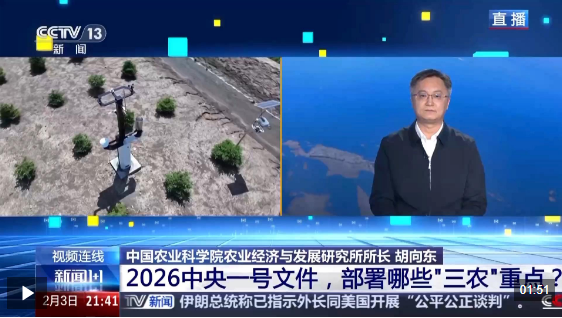2026年中央一号文件2月3日发布,对锚定农业农村现代化、扎实推进乡村全面振兴进行了部署。目前,我国粮食产量已连续两年稳定在1.4万亿斤以上,如何提升农业综合生产能力和质量效益成为重中之重。除了稳定发展粮油生产,文件明确提出加强农业关键核心技术攻关和科技成果高效转化应用。与此同时,文件将实施常态化精准帮扶单独列为一项重要工作任务,强调要培育壮大县域富民产业、促进农民工稳岗就业。保障粮食安全如何再升级?现代农业科技要如何提高效能?常态化精准帮扶机制如何有效建立?《新闻1+1》本期节目连线中国农业科学院农业经济与发展研究所所长胡向东,进行解读。
