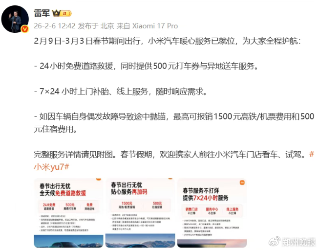 2月6日,小米创始人雷军发文称,2月9日~3月3日春节期间出行,小米汽车将开启三项暖心服务,包括24小时免费道路救援,同时提供500元打车券与异地送车服务;7×24小时上门补胎、线上服务;如因车辆自身偶发故障导致途中抛锚,最高可报销1500元高铁/机票费用和500元住宿费用。