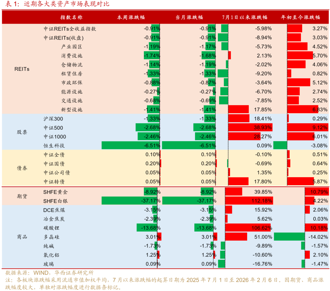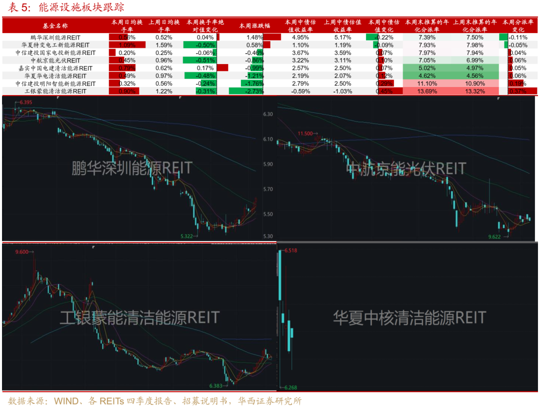 能源设施本周跌幅最小。整体来看,风电、光伏、水电2025年四季度受区域新增装机带来的消纳压力较大,并且来风来光来水同比下降较为明显,能源类项目也有较大的业绩波动,优先关注稳定性较高的天然气发电、水电类资产或可供分配金额保障度高的项目,如中航京能光伏、华夏中核清洁能源、工银蒙能清洁能源。