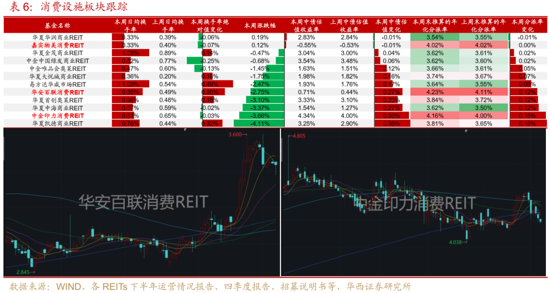 消费基础设施板块本周跌幅最大。本周调整后,仍可关注分派率较高的消费设施REITs有华安百联消费、嘉实物美消费和中金印力消费。
