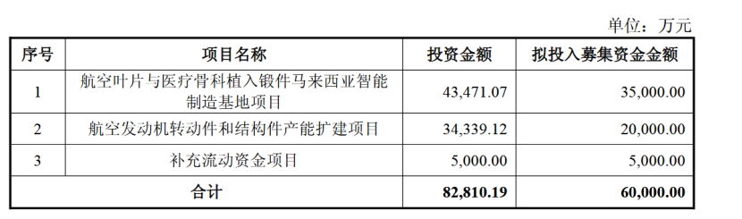 其中,拟募资金额最高的为航空叶片与医疗骨科植入锻件马来西亚智能制造基地项目。