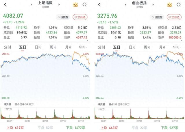 A股三大股指2月13日集体低开。全天市场呈现震荡下行的走势,尾盘跌幅扩大。