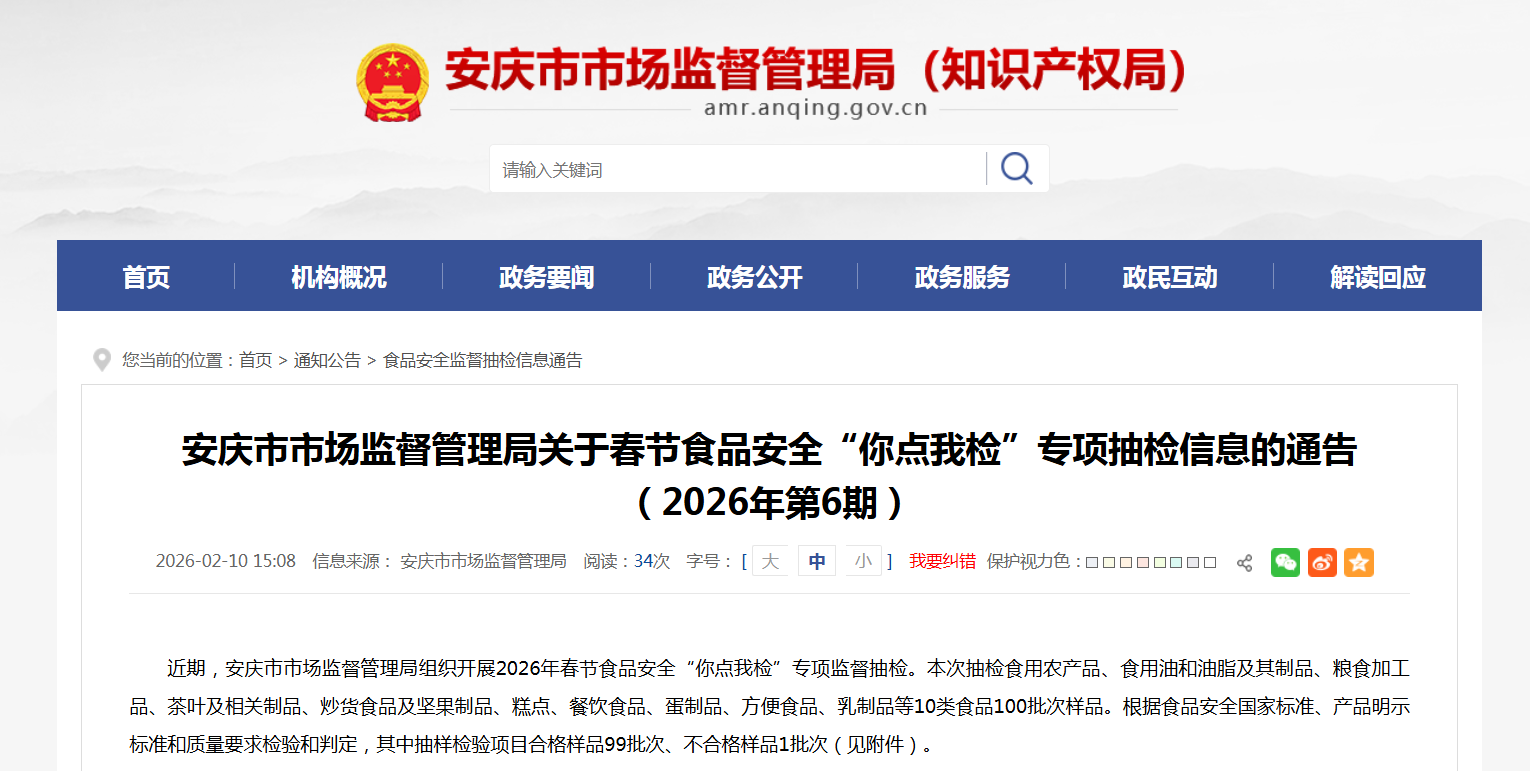 近期,安庆市市场监督管理局组织开展2026年春节食品安全“你点我检”专项监督抽检。本次抽检食用农产品、食用油和油脂及其制品、粮食加工品、茶叶及相关制品、炒货食品及坚果制品、糕点、餐饮食品、蛋制品、方便食品、乳制品等10类食品100批次样品。根据食品安全国家标准、产品明示标准和质量要求检验和判定,其中抽样检验项目合格样品99批次、不合格样品1批次(见附件)。