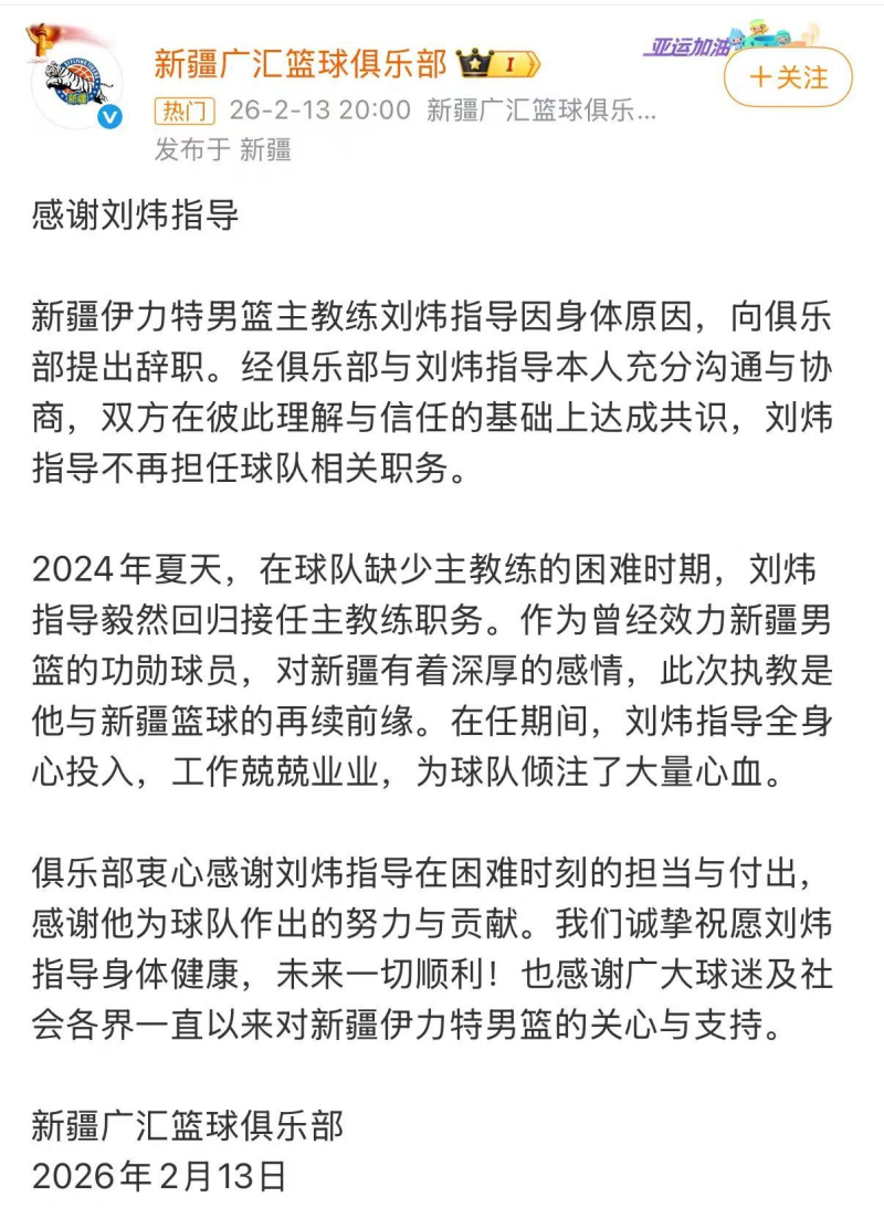 2月13日,新疆广汇篮球俱乐部通过微博发布公告,称主教练刘炜因身体原因辞职,不再担任球队相关职务。