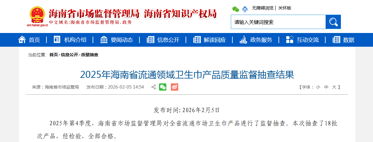 2025年第4季度,海南省市场监督管理局对全省流通市场卫生巾产品进行了监督抽查。本次抽查了18批次产品,经检验,全部合格。