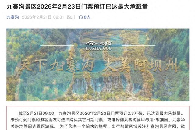 2月21日,九寨沟景区发布的消息显示,截至2月21日09:00,九寨沟景区2026年2月23日门票预订2.3万张,已达到最大承载量。