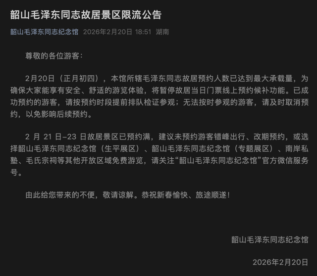 韶山毛泽东同志纪念馆2月20日发布的消息就显示,2月21日-23日故居景区已预约满,建议未预约游客错峰出行、改期预约,或选择韶山毛泽东同志纪念馆(生平展区)、韶山毛泽东同志纪念馆(专题展区)、南岸私塾、毛氏宗祠等其他开放区域免费游览。