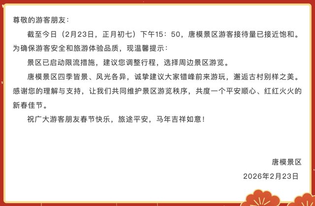 唐模景区发布的消息显示,截至2月23日15:50,唐模景区游客接待量已接近饱和。景区已启动限流措施。