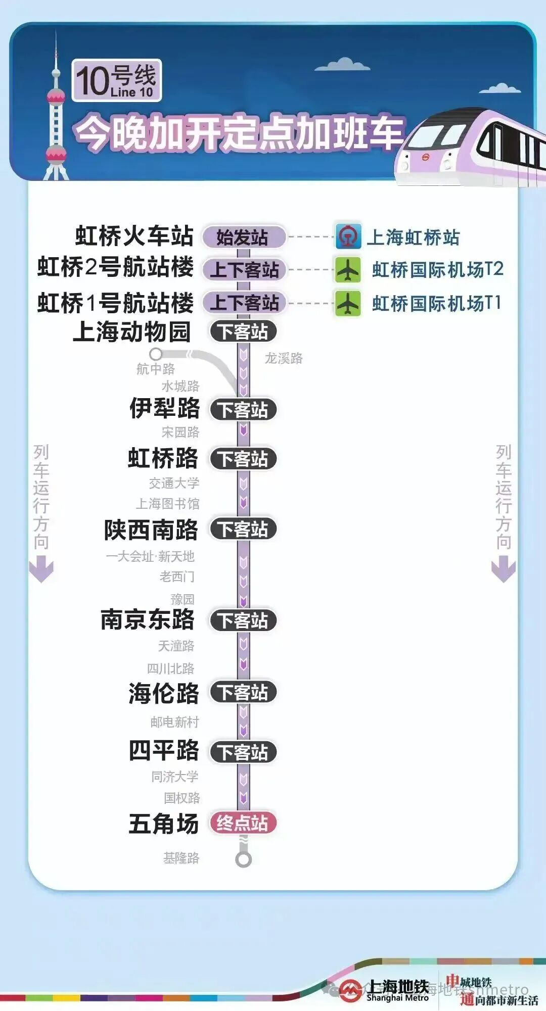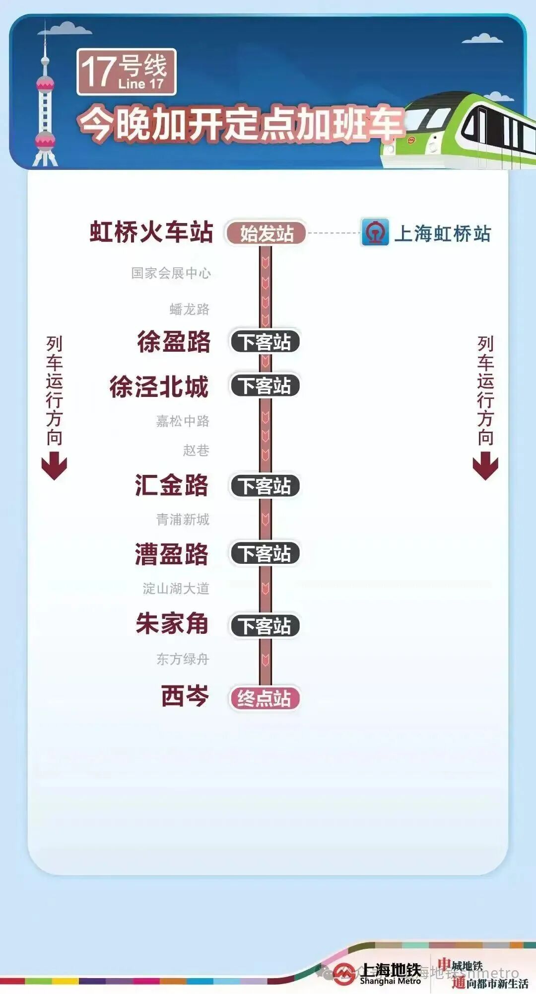 申通地铁集团介绍,为满足春运期间乘客夜间出行需求,今晚(2月25日),2号线加开定点加班车,虹桥火车站站往龙阳路站加开至次日(2月26日)0时20分;9号线加开定点加班车,上海松江站站往杨高中路站加开至次日(2月26日)0时20分;10号线加开定点加班车,虹桥火车站站往五角场站加开至23时30分;17号线加开定点加班车,虹桥火车站站往西岑站加开至23时30分。定点加班车只停靠指定站点。