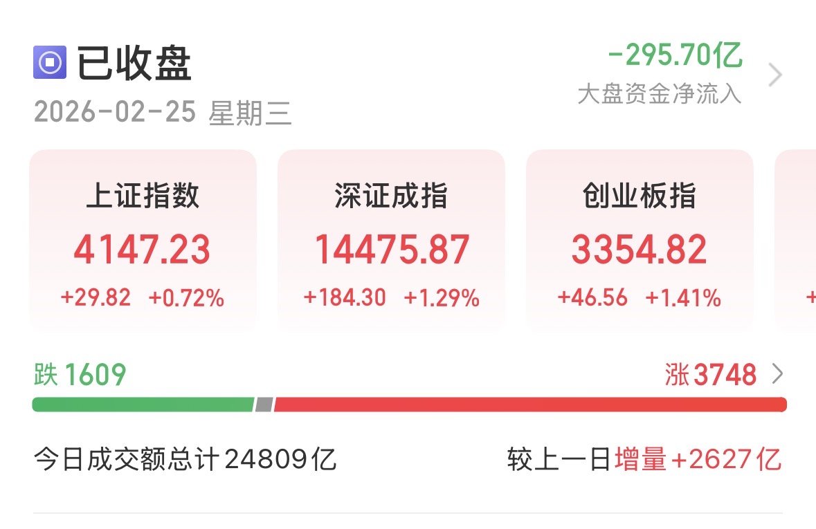 2月25日,A股三大指数集体上涨。截至收盘,沪指涨0.72%,收报4147.23点;深证成指涨1.29%,收报14475.87点;创业板指涨1.41%,收报3354.82点。