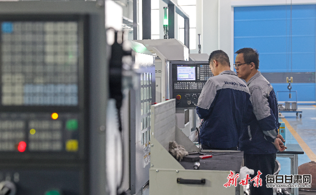 兰州莫尼塞克空间技术有限公司生产车间工作人员正在操作机床控制系统。新甘肃·甘肃日报记者 冯乐凯摄。
