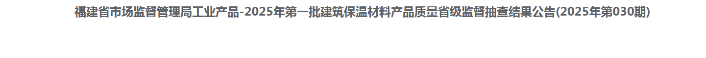 中国质量新闻网讯 近日,福建省市场监督管理局网站公布2025年第一批建筑保温材料产品质量省级监督抽查结果(2025年第030期)。本期共抽查36家企业36批次,其中合格批次29个,不合格批次7个。