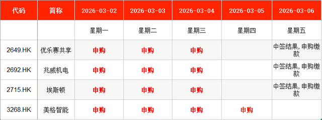其中,优乐赛共享(02649.HK)、兆威机电(02692.HK)、埃斯顿(02715.HK)等均在周一至周三申购;美格智能(03268.HK)周一至周四申购。