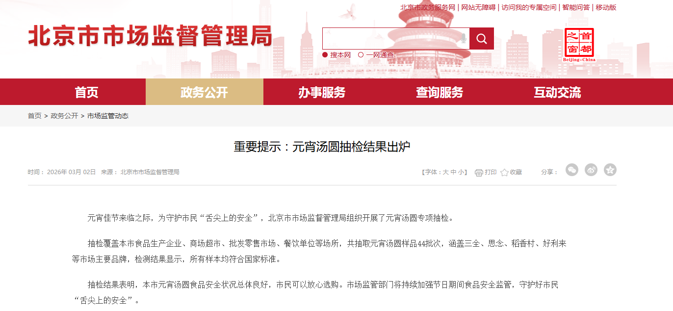 元宵佳节来临之际,为守护市民“舌尖上的安全”,北京市市场监督管理局组织开展了元宵汤圆专项抽检。