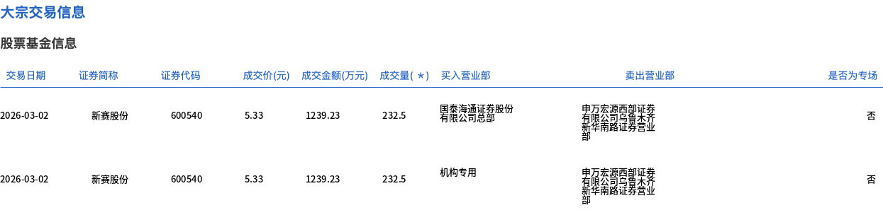 新赛股份今日大宗交易折价成交465万股,成交额2478.46万元