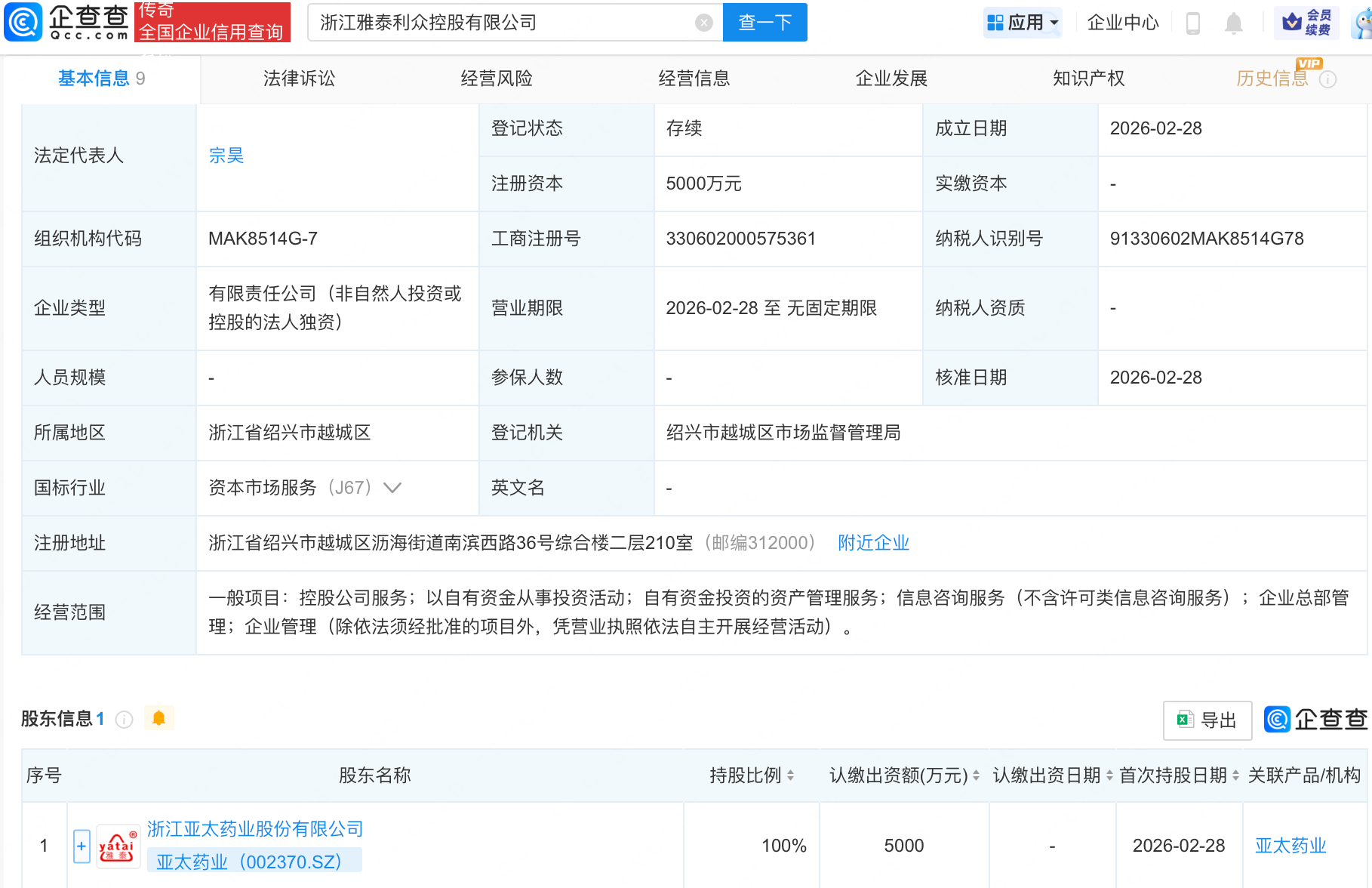 企查查APP显示,近日,浙江雅泰利众控股有限公司成立,注册资本5000万元,经营范围包含:控股公司服务;以自有资金从事投资活动;自有资金投资的资产管理服务等。企查查股权穿透显示,该公司由亚太药业(002370.SZ)全资持股。