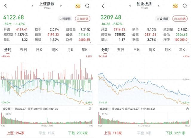 至收盘,上证综指跌1.43%,报4122.68点;科创50指数跌5.21%,报1388.41点;深证成指跌3.07%,报14022.39点;创业板指跌2.57%,报3209.48点。