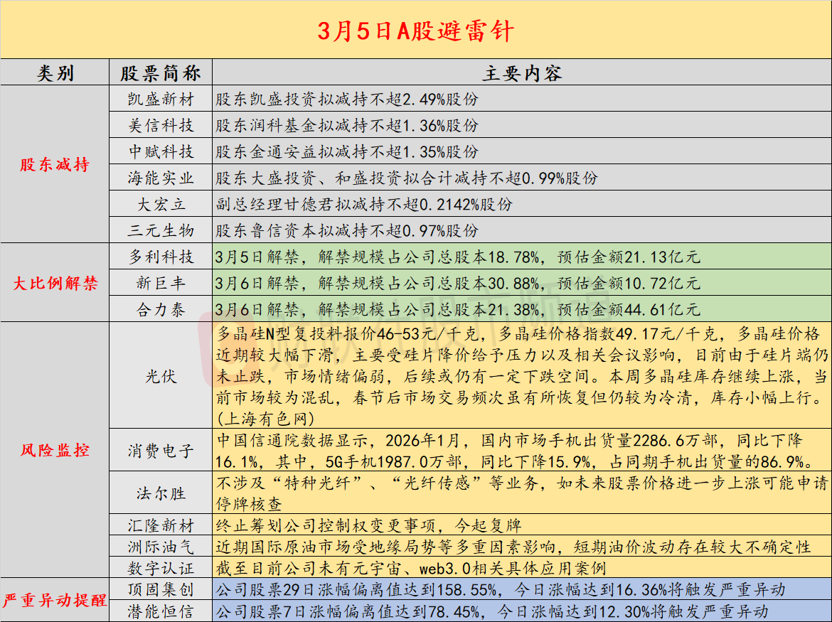 导读:财联社3月5日投资避雷针,近日A股及海外市场潜在风险事件如下。国内经济信息方面包括:1)多晶硅价格近期大幅下滑;2)信通院数据显示,1月国内市场手机出货量2286.6万部,同比下降16.1%;公司方面重点关注包括:1)8天6板法尔胜表示不涉及“特种光纤”、“光纤传感”等业务,如未来股票价格进一步上涨可能申请停牌核查;2)汇隆新材终止筹划公司控制权变更事项,今起复牌;海外市场重点关注包括:1)美财长称美对全球15%关税预计本周生效;2)普京说考虑主动给欧洲“断气”。