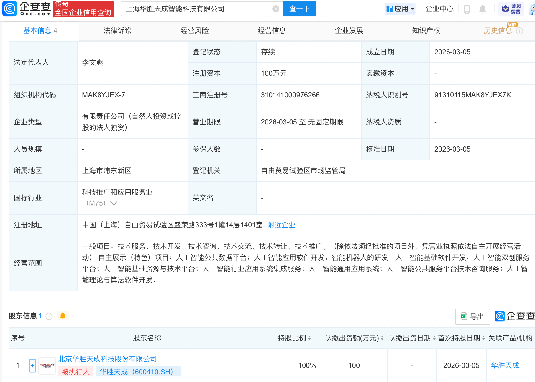企查查APP显示,近日,上海华胜天成智能科技有限公司成立,经营范围包含:人工智能公共数据平台;人工智能应用软件开发;智能机器人的研发;人工智能基础软件开发;人工智能双创服务平台等。企查查股权穿透显示,该公司由华胜天成(600410.SH)全资持股。