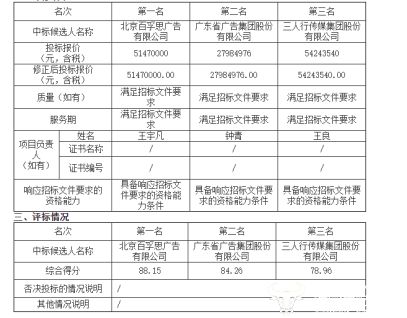 经过一系列评审,最终排在前三名的中标候选人分别是:北京百孚思广告有限公司、广东省广告集团股份有限公司、三人行传媒集团股份有限公司。其中,广东省广的报价低到让人惊讶!