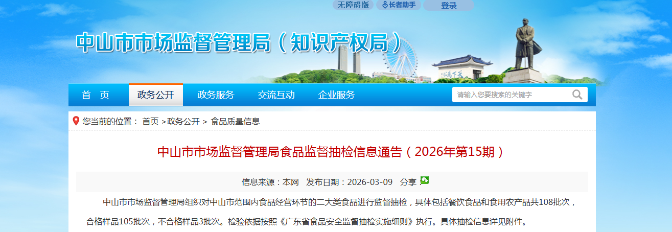 中山市市场监督管理局组织对中山市范围内食品经营环节的二大类食品进行监督抽检,具体包括餐饮食品和食用农产品共108批次,合格样品105批次,不合格样品3批次。检验依据按照《广东省食品安全监督抽检实施细则》执行。具体抽检信息详见附件。
