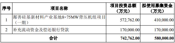 本次向特定对象发行股票募集资金总额不超过人民币580,000.00万元(含本数),扣除相关发行费用后的募集资金净额拟用于鄯善硅基新材料产业基地8×75MW背压机组项目(一期)、补充流动资金及偿还银行贷款。