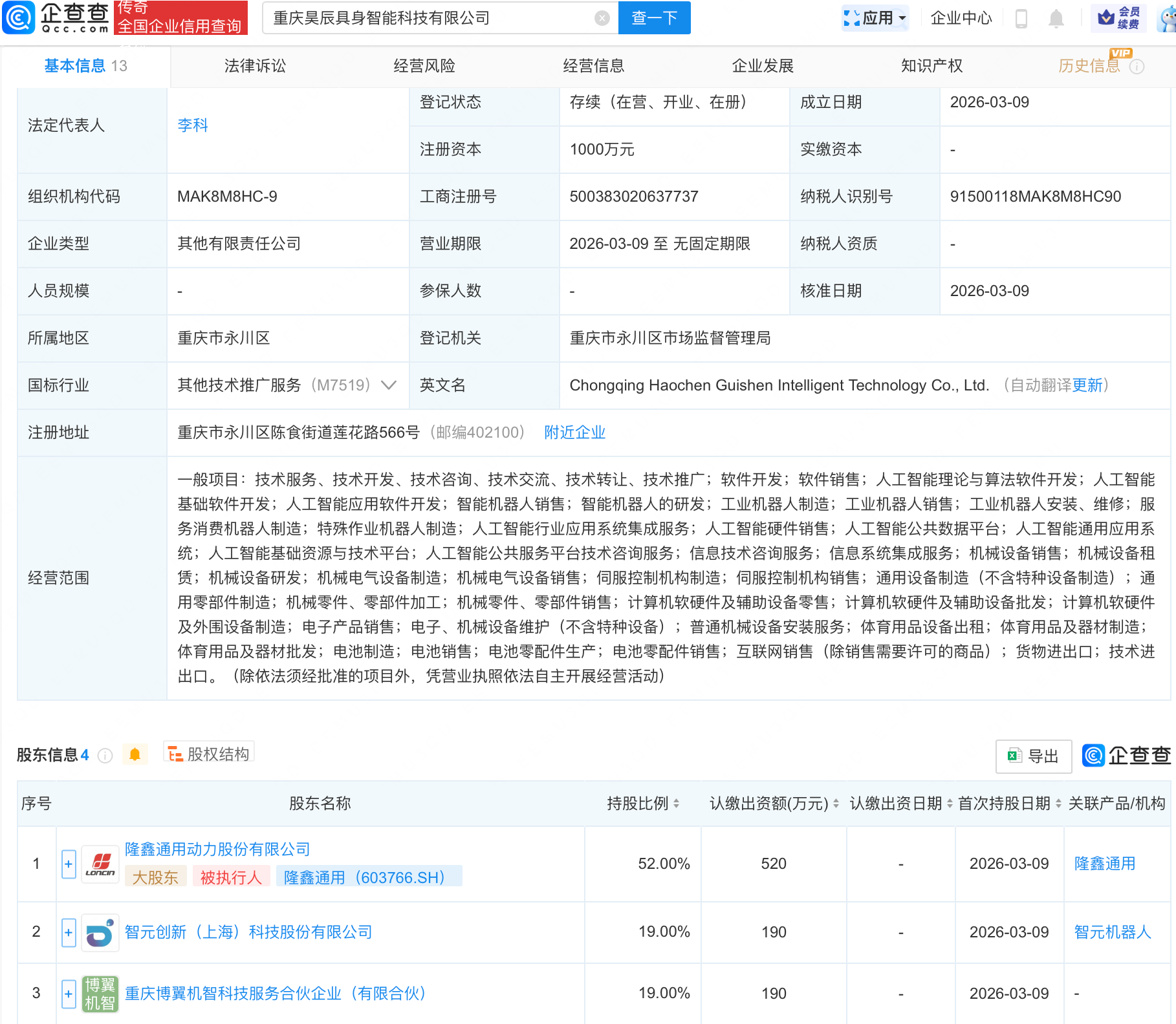 企查查 APP 显示,近日,智元机器人关联公司智元创新(上海)科技股份有限公司分别携手隆鑫通用(603766.SH)、卧龙电驱(600580.SH)新设重庆昊辰具身智能科技有限公司,浙江智龙未来机器人有限公司,经营范围均包含智能机器人的研发;人工智能硬件销售等。