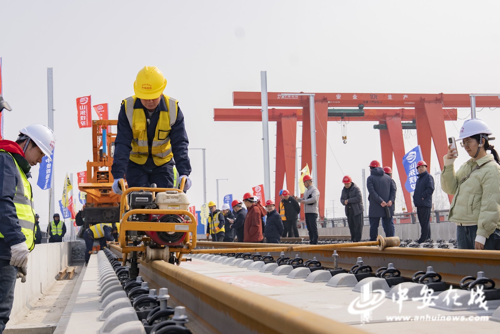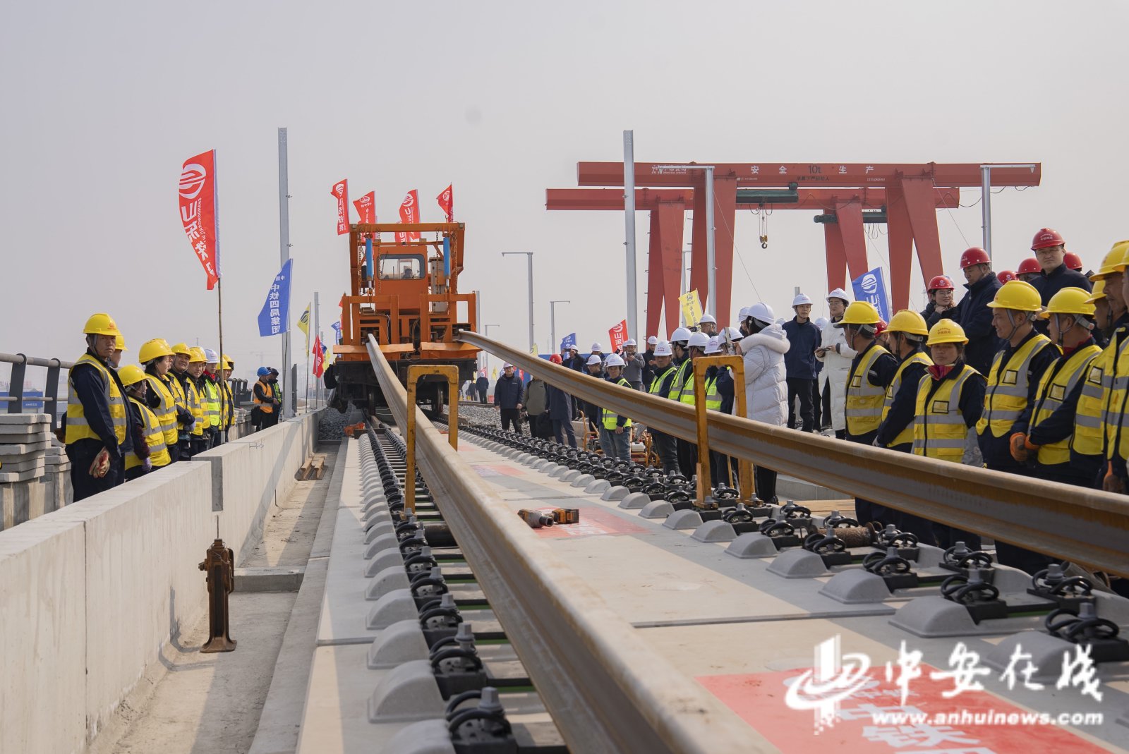 中安在线、中安新闻客户端讯 3月10日上午,在山东省滨州市滨州站济滨高铁建设现场,首对500米长钢轨平稳精准铺设在惠滨2号特大桥无砟道床上,标志着中铁四局参建的济滨高铁正式进入铺轨施工阶段。