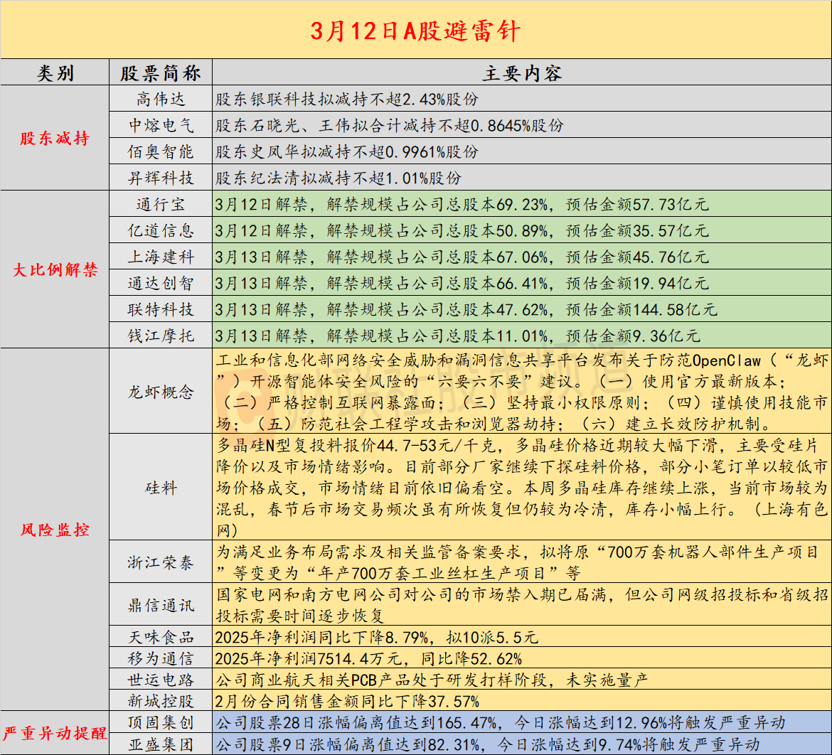 导读:财联社3月12日投资避雷针,近日A股及海外市场潜在风险事件如下。国内经济信息方面包括:1)工信部NVDB发布关于防范龙虾安全风险的“六要六不要”建议;2)部分厂家继续下探硅料价格,市场情绪目前依旧偏看空;公司方面重点关注包括:1)浙江荣泰为满足业务布局需求及相关监管备案要求,拟将原“700万套机器人部件生产项目”等变更为“年产700万套工业丝杠生产项目”等;2)2连板鼎信通讯提示风险,国家电网和南方电网公司对公司的市场禁入期已届满,但公司网级招投标和省级招投标需要时间逐步恢复;海外市场重点关注包括:1)伊朗称完全有能力封锁霍尔木兹海峡,视美以及其盟友船只可合法打击;2)国际油价大幅上涨,3月12日亚洲时段WTI原油期货一度涨8%;布伦特原油期货涨近6%。
