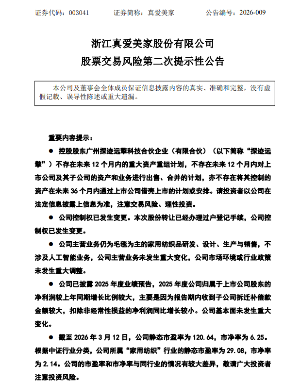 3月12日,真爱美家(003041.SZ)披露股票交易风险第二次提示性公告称,公司关注到有关媒体在网络上流传关于公司被收购后将“变更主营业务”“被借壳”的传闻。经公司核实,公司的主营业务仍为毛毯为主的家用纺织品研发、设计、生产与销售,不涉及人工智能业务,公司主营业务未发生重大变化。控股股东亦不存在将其控制的资产在未来36个月内通过上市公司借壳上市的计划或安排。请投资者以公司在法定信息披露上信息为准,注意交易风险、理性投资。
