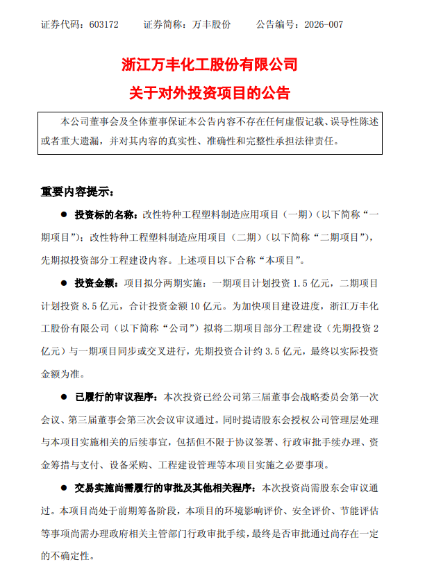 3月13日,万丰股份(603172.SH)公告称,公司计划在浙江省绍兴市柯桥区建设改性特种工程塑料制造应用项目,项目分为两期实施。一期项目计划投资1.5亿元,二期项目计划投资8.5亿元,合计投资金额10亿元。为加快项目建设进度,公司拟将二期项目部分工程建设与一期项目同步或交叉进行,先期投资合计约3.5亿元。项目预计不会对公司本年度的经营成果产生重大影响,但长远来看,若项目顺利建成并达产,预计对公司未来业务发展和财务状况产生积极影响。