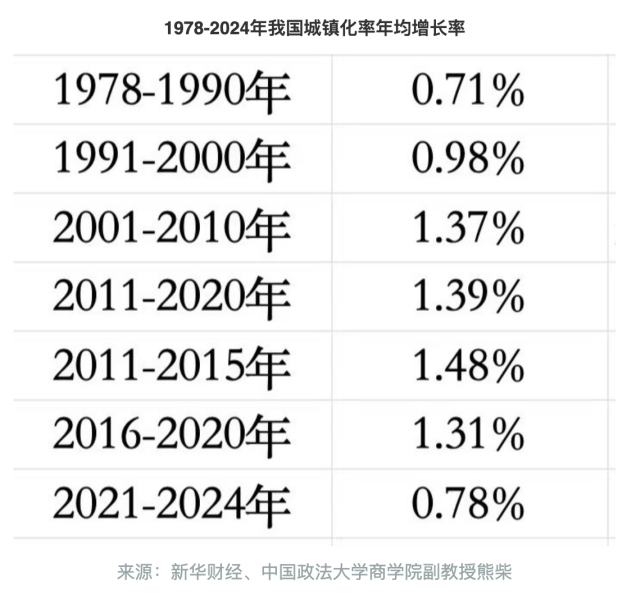 但中国的城镇化在经过前期的高速发展后,已经趋于稳定。在中国政法大学商学院副教授熊柴对城镇化率的解读中,2001-2010年和2011-2020年,是中国城镇化速度最快的两个十年,城镇化率年均分别提高了1.37和1.39个百分点,但在2021年-2024年,中国常住人口城镇化率年均提高只有0.78个百分点。