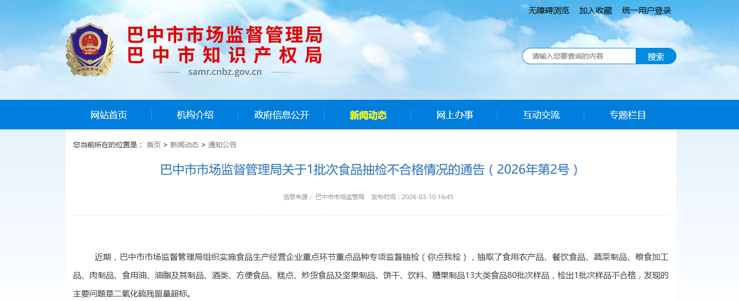 近期,巴中市市场监督管理局组织实施食品生产经营企业重点环节重点品种专项监督抽检(你点我检),抽取了食用农产品、餐饮食品、蔬菜制品、粮食加工品、肉制品、食用油、油脂及其制品、酒类、方便食品、糕点、炒货食品及坚果制品、饼干、饮料、糖果制品13大类食品80批次样品,检出1批次样品不合格,发现的主要问题是二氧化硫残留量超标。