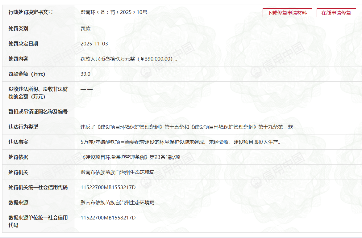 2025年11月,据黔南州生态环境局发布的行政处罚决定书,芭田股份控股公司贵州芭田新能源材料有限公司的“5万吨/年磷酸铁项目”需要配套建设的环境保护设施未建成、未经验收,建设项目即投入生产。该行为违反了《建设项目环境保护管理条例》相关规定。黔南州生态环境局对其处以39万元罚款。