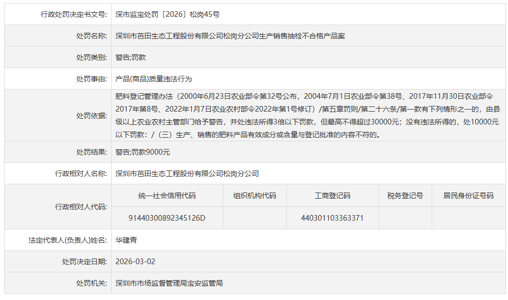 公告显示,芭田股份松岗分公司因生产、销售的肥料产品有效成分或含量与登记批准的内容不符,被深圳市市场监督管理局宝安监管局处以警告并罚款9000元。行政处罚决定书文号为深市监宝处罚〔2026〕松岗45号。