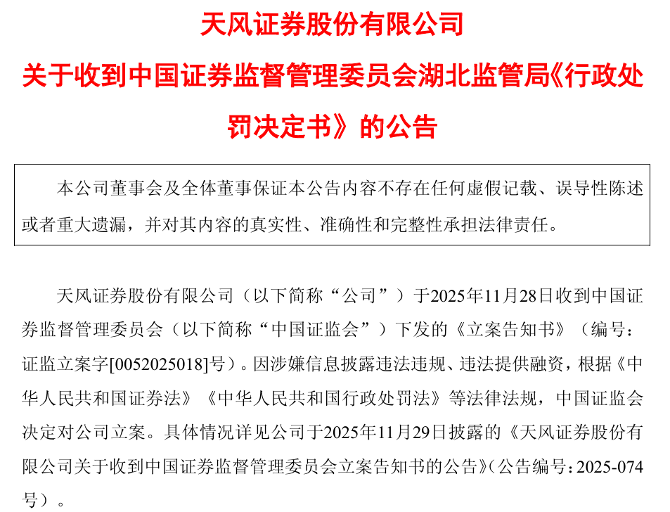 近日,天风证券(证券代码:601162)发布公告称,因涉嫌信息披露违法违规、违法为股东提供融资,公司于3月13日收到中国证监会湖北监管局下发的《行政处罚决定书》。同日,公司收到福建证监局针对其涉及永安林业持股变动信披违规的另一份《行政处罚决定书》。