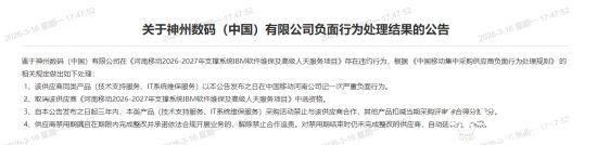 公告显示,神州数码(中国)有限公司在《河南移动2026-2027年支撑系统IBM软件维保及高级人天服务项目》存在违约行为。